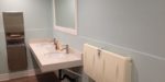 To accommodate an additional stall in each bathroom the hallway walls inside both bathrooms will be removed. This will allow us to widen the entrance doors and to open the area for a storage cabinet and changing table in each bathroom.